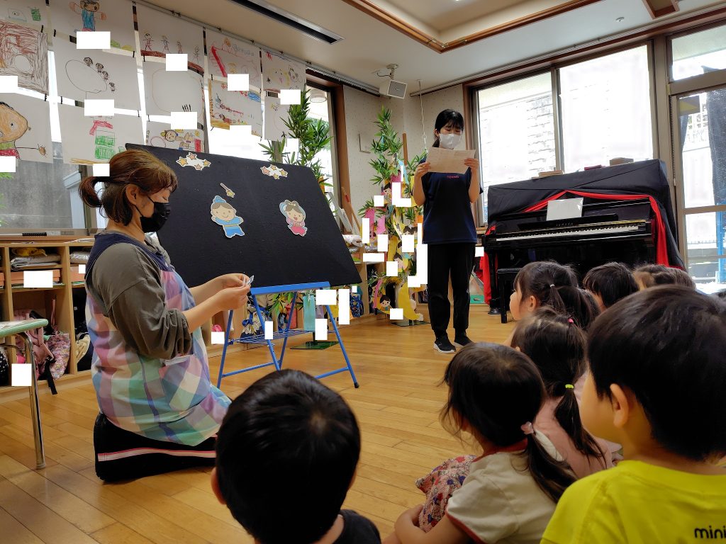 まず最初に七夕の由来について、パネルシアターを見たり、保育教諭の話を聞いたりしました。
