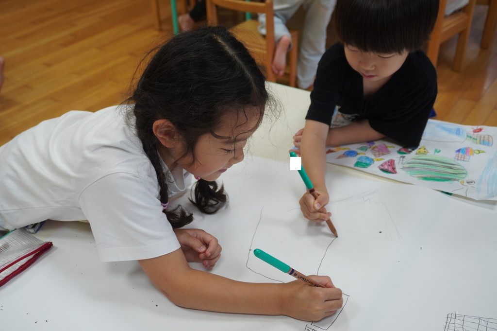 模造紙に下書きを行い、子供たちは紙の大きさみて、