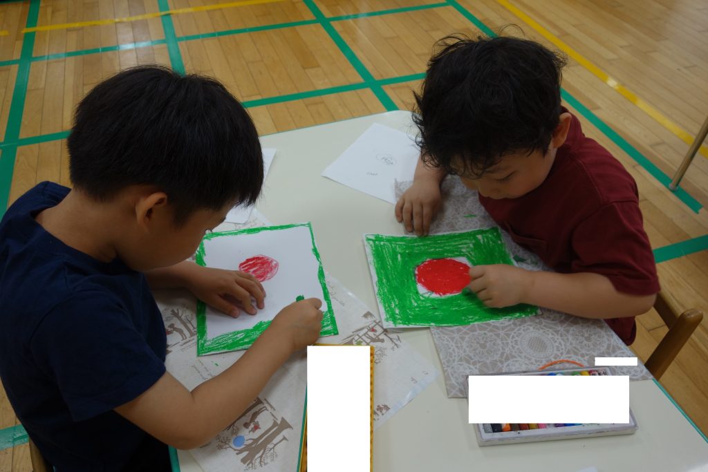 「日本だよ」「アメリカだよ」国旗つくりの活動によって