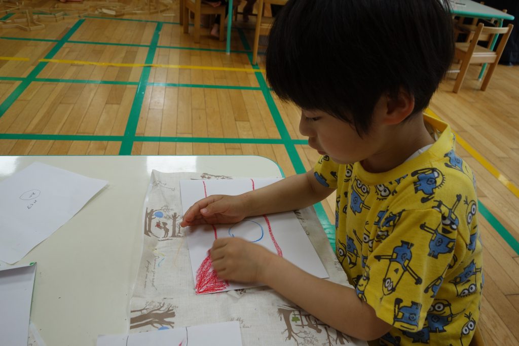 「ここは緑だね」「赤だね」と自分で描いた下書きを手本にしながら