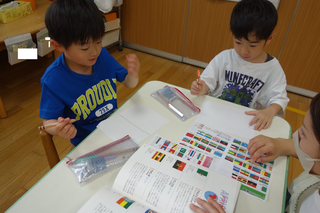 国旗に興味を持ち、毎日のように図鑑を見ながら友だちと楽しんでいますよ。
