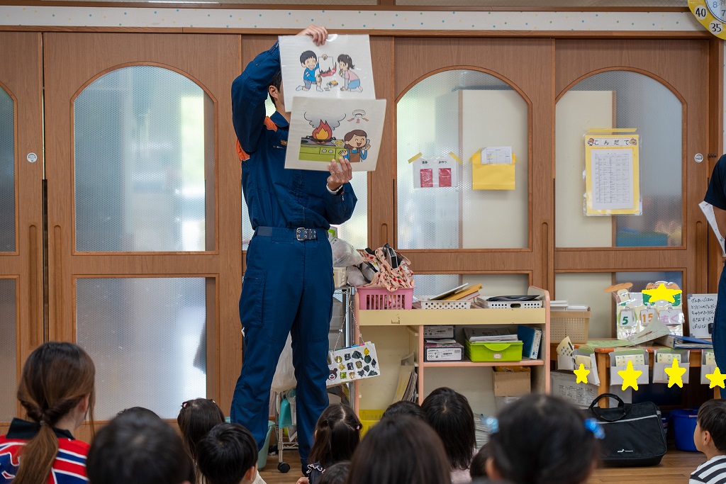 消防士の方から幼年消防についてどんなことをするのか話を聞きました。そのときの様子をお見せします☆