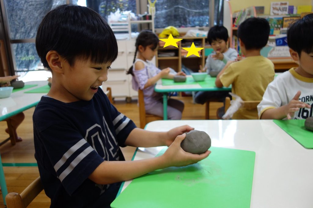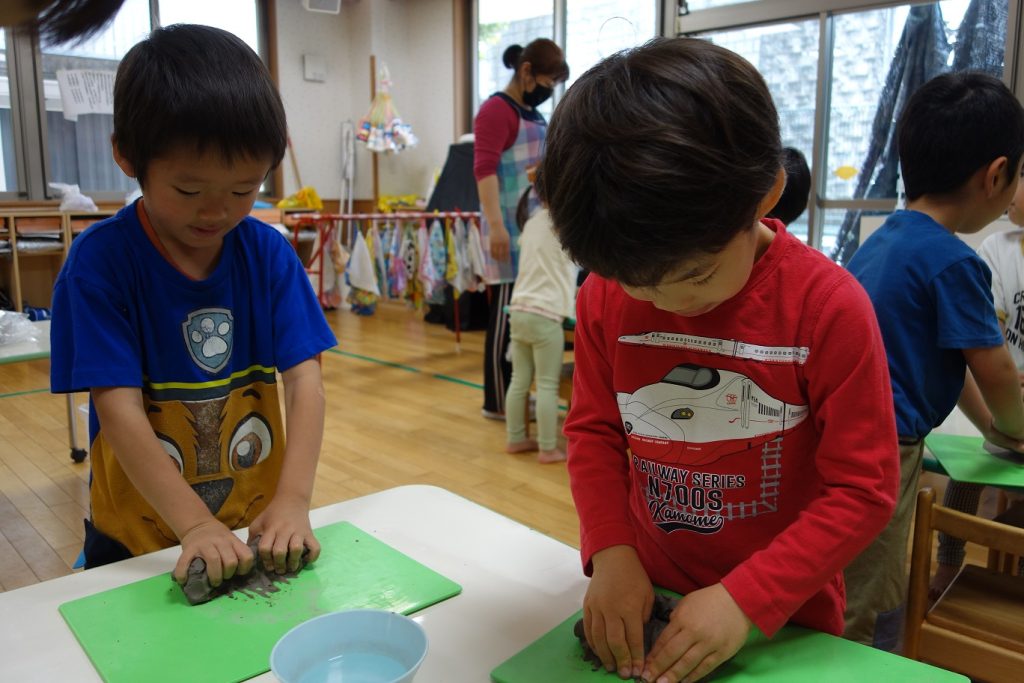 土を触ると「つるつるしてる!」「何だか柔らかいね」と普段触れる土との違いに気付いていました。