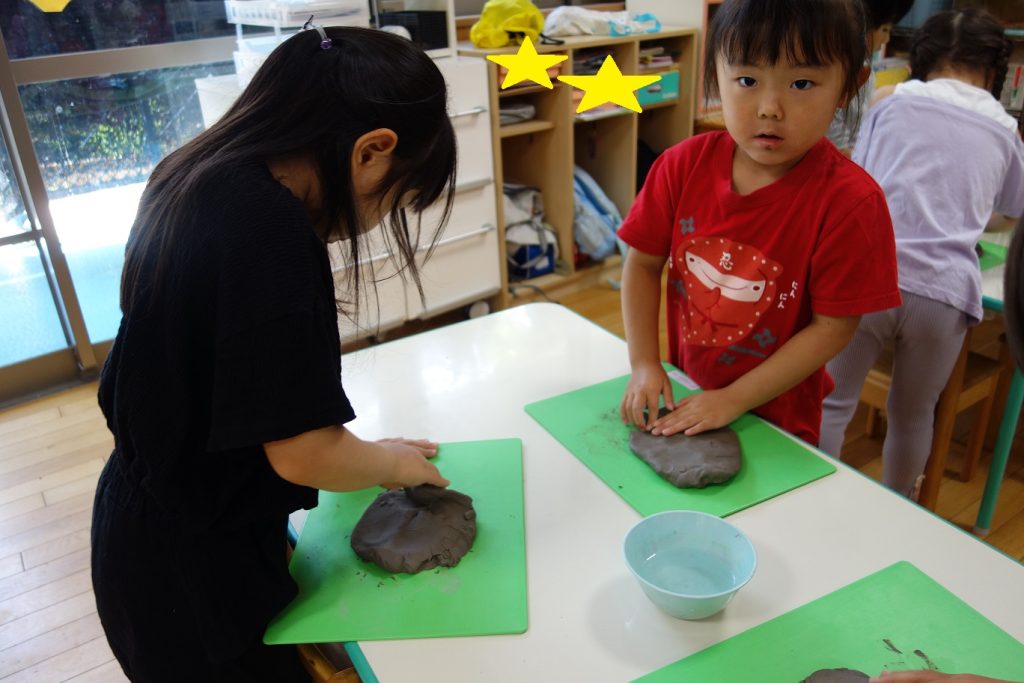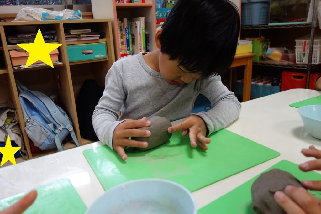 土をこねるときは体重をかけたり、手の腹を使ったりするなど集中してしっかりとこねる練習を行ないました。