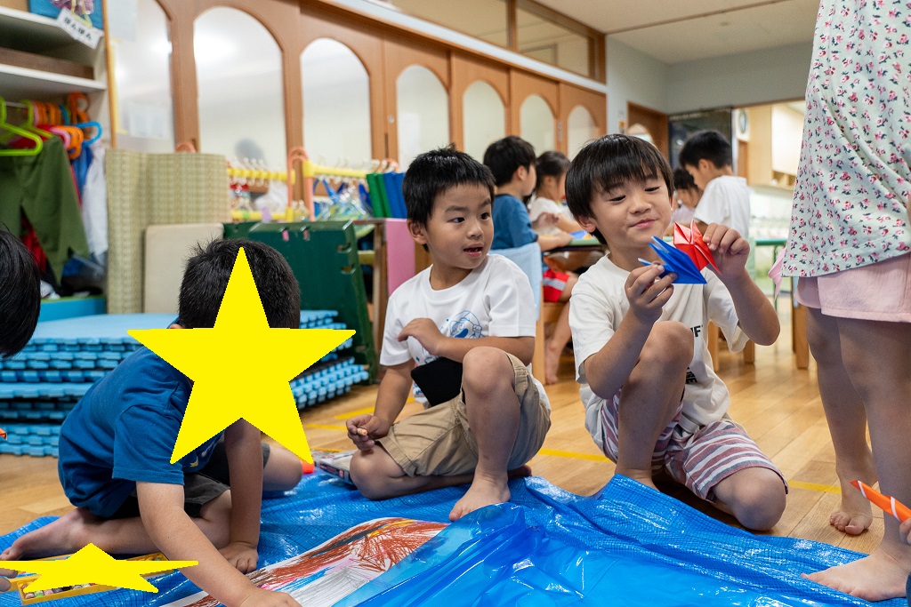 海の生き物を折り紙で折ったり、海にちなんだものをクレヨンで描いたりしました。