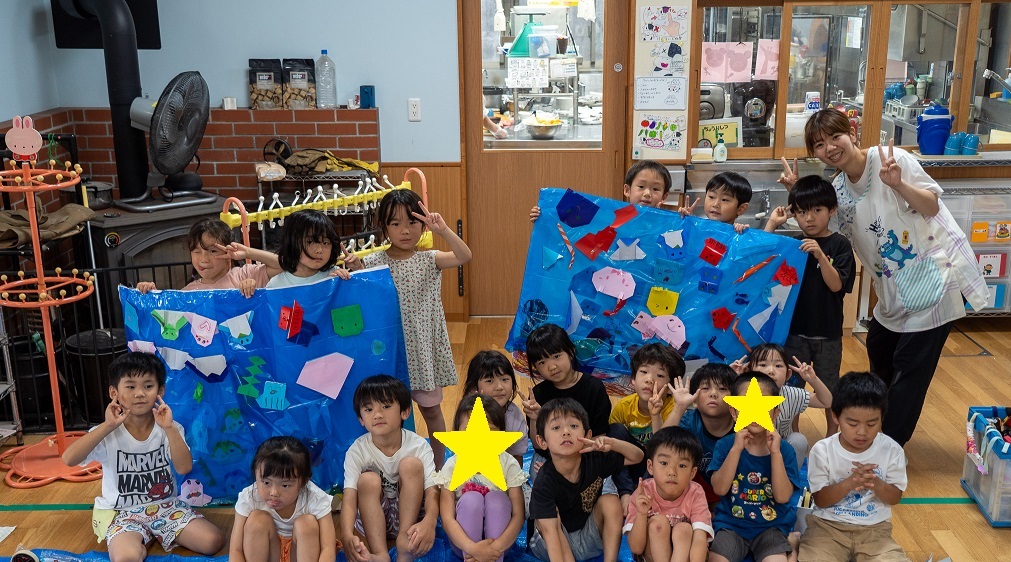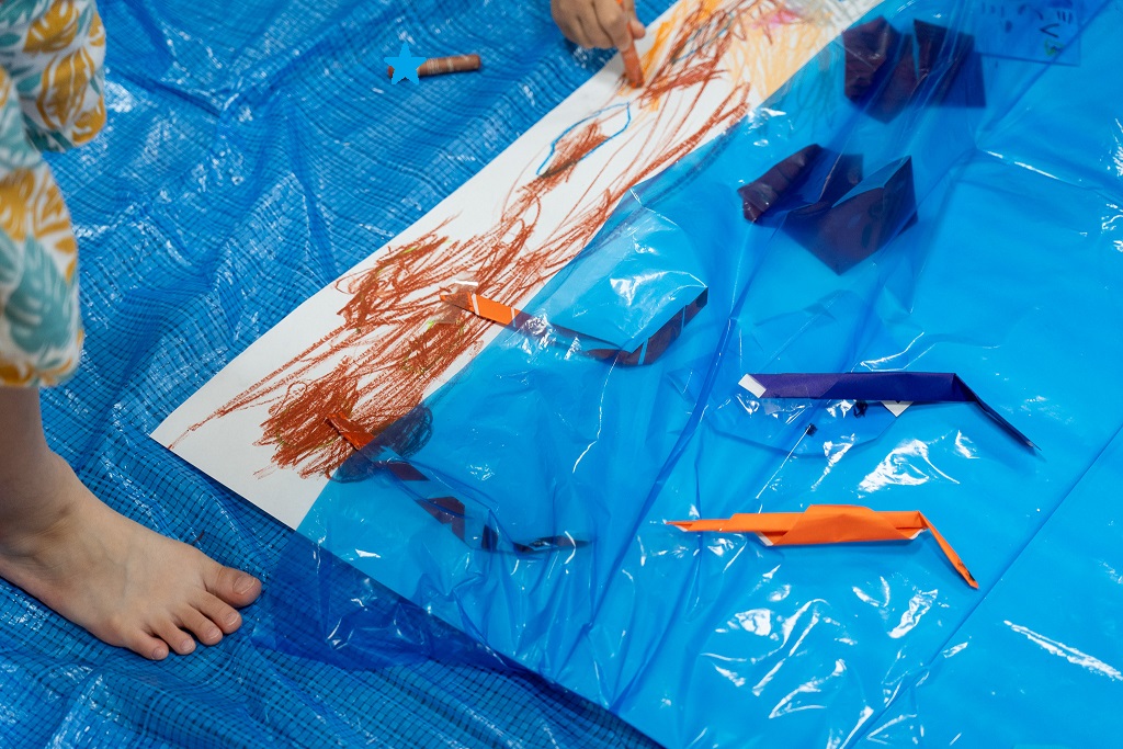 先日折り紙やクレヨンを使って模造紙に海を作りました☆