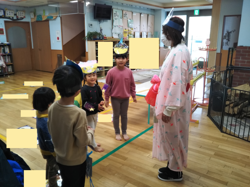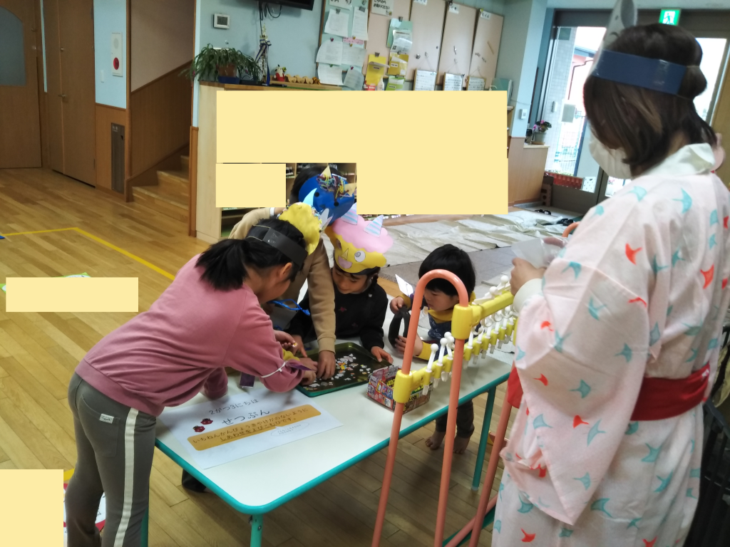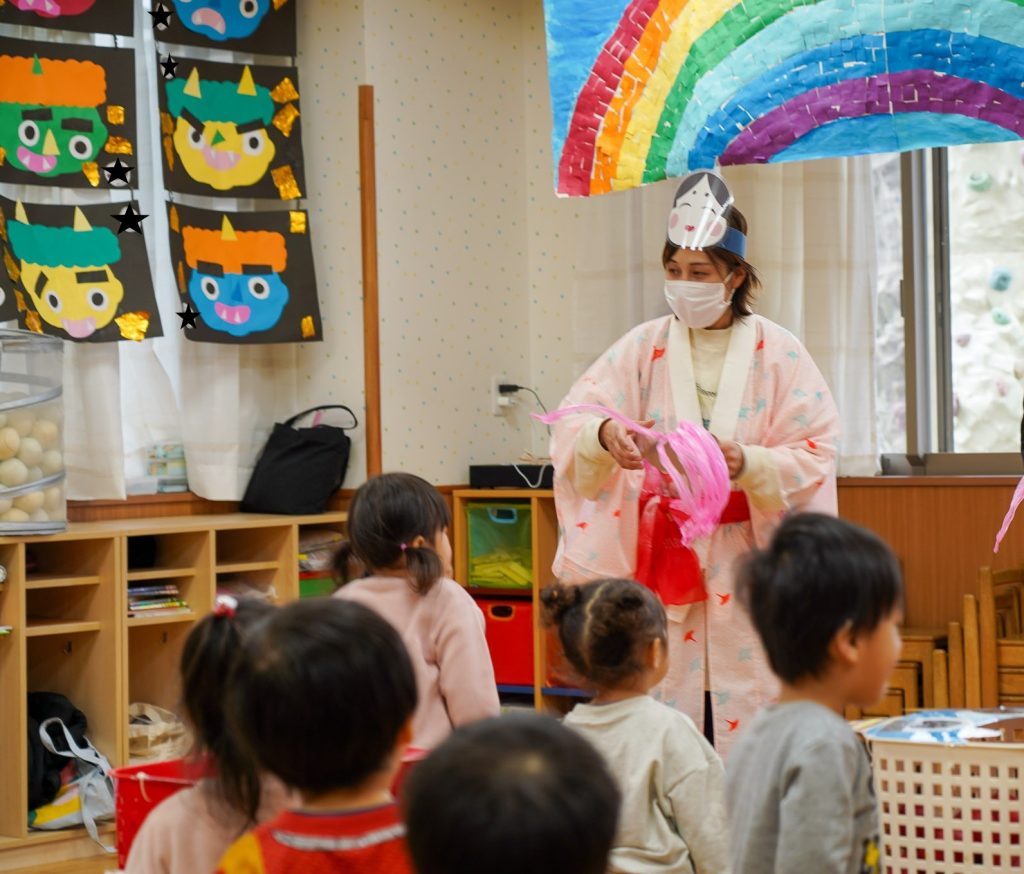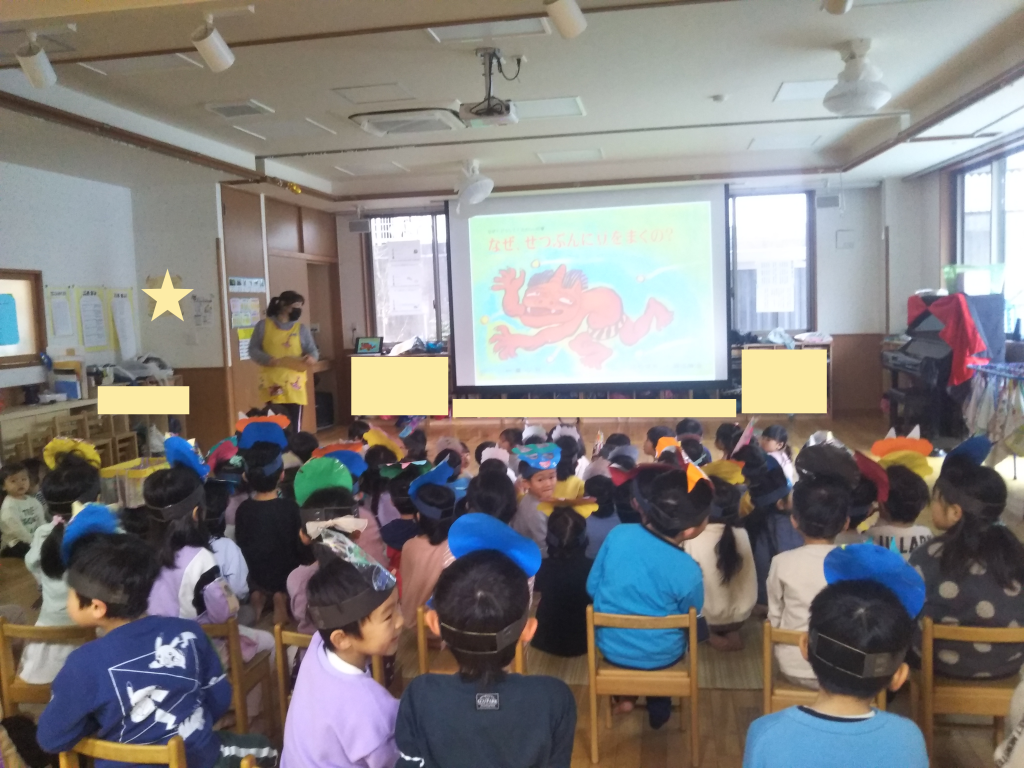 集会では、自分たちで作ったお面を被り、紙芝居を聞いたり節分の由来などを知ることができました。