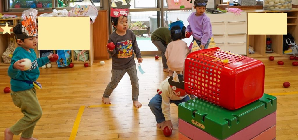登園後「鬼来る?」「豆まきするのかな?」など豆まき集会を楽しみにしている姿が見られました。