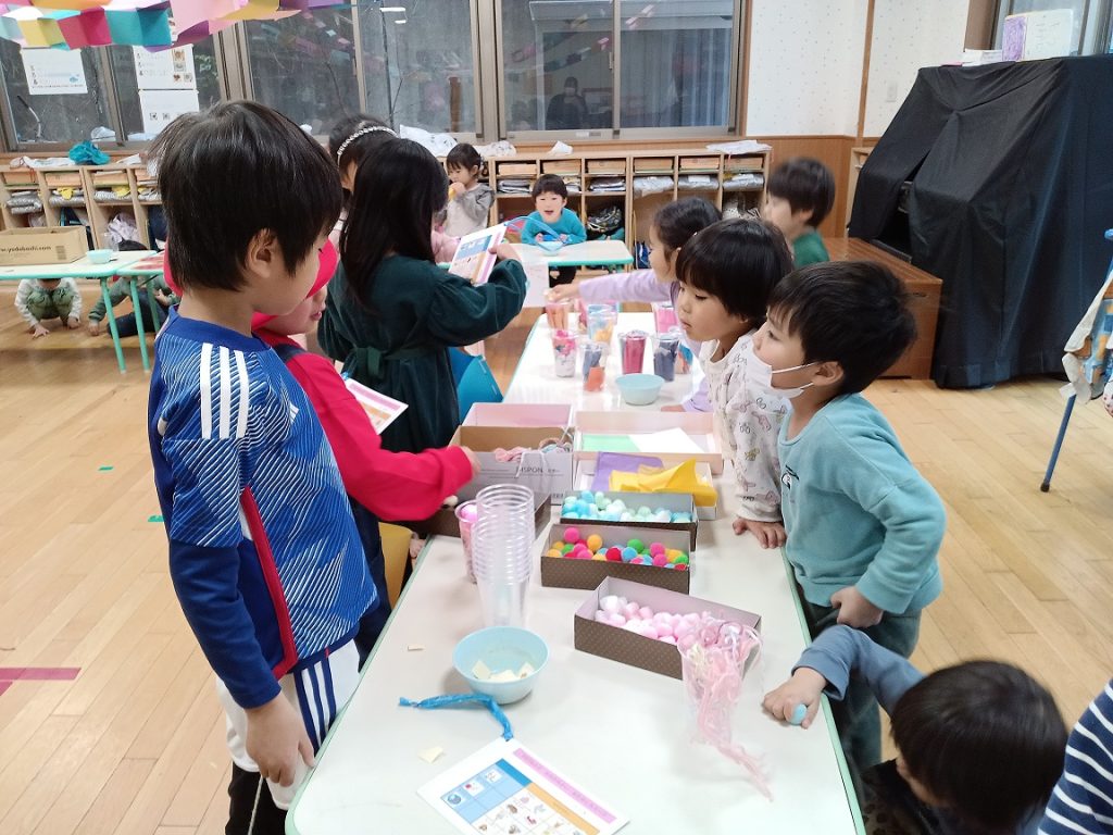 日頃の感謝の気持ちを込めて、くまグループとぱんだグループの子供たちはお店屋さんごっこでおもてなし!やきそばやパフェなどの食べ物を売ったり、魚釣りやボーリングなどのゲームをしたりしました。