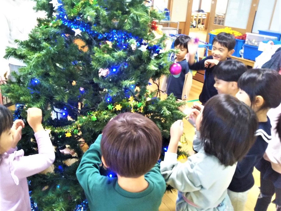 ツリーの頂上に付ける星の色や、周りの装飾など子供たちと一緒に選びながら飾り付けをしました。