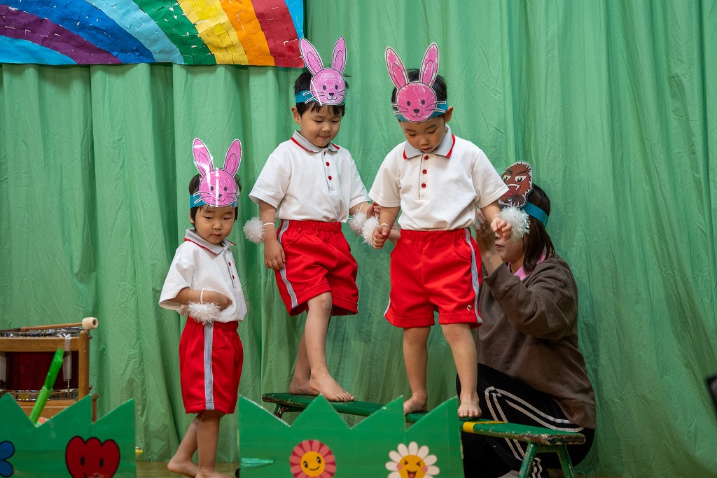 ぱんだグループの子供たちは、自分で色を塗ったお面を被り、歌を歌ったり太鼓を叩いたり、平均台を渡ったりしていました。