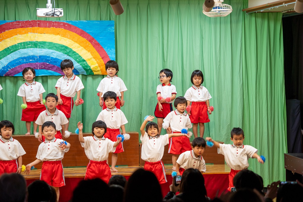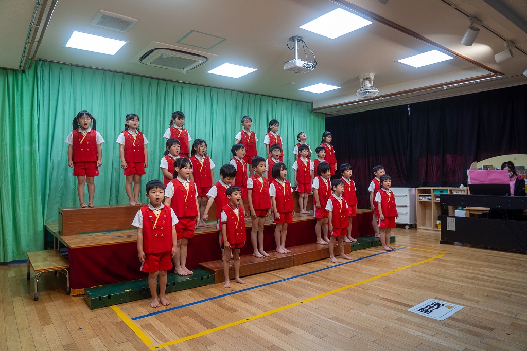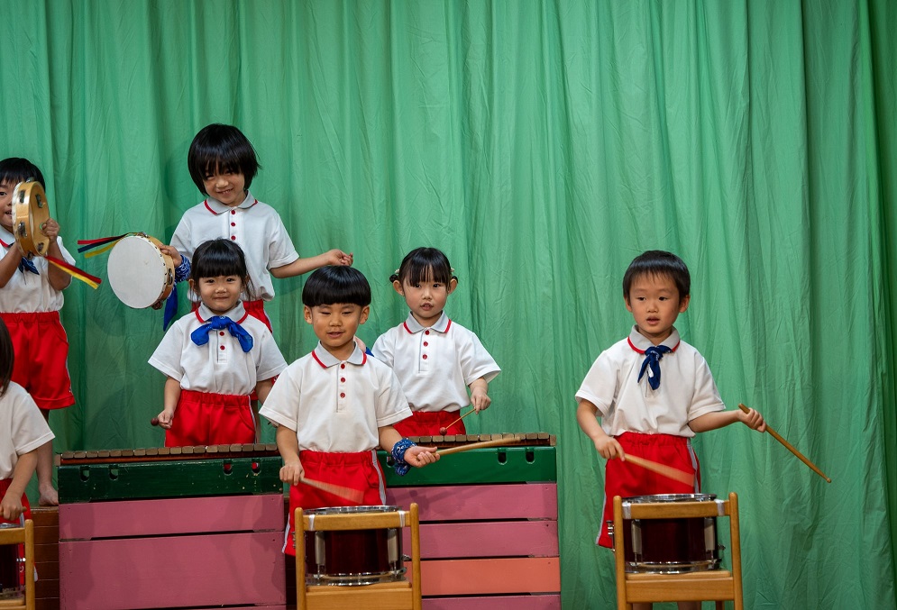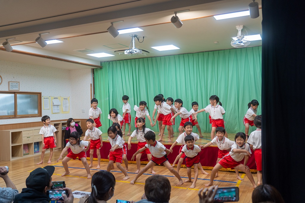 きりんグループは楽器・劇・歌を披露しました。創作ダンスやみんなでリズムを合わせて演奏した楽器、ベストを身にまとって披露した歌、どれも年長児らしい姿を見せてくれました。