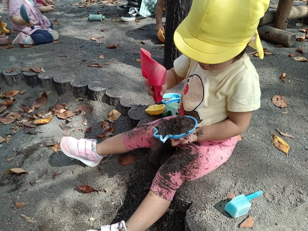 シャベルで砂をすくい、型抜きに入れて型抜きをすることがブームです。