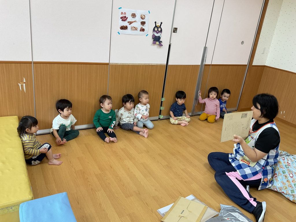 1歳児のうさぎ・らっこグループです。模倣・楽器遊びの様子をお見せします。
