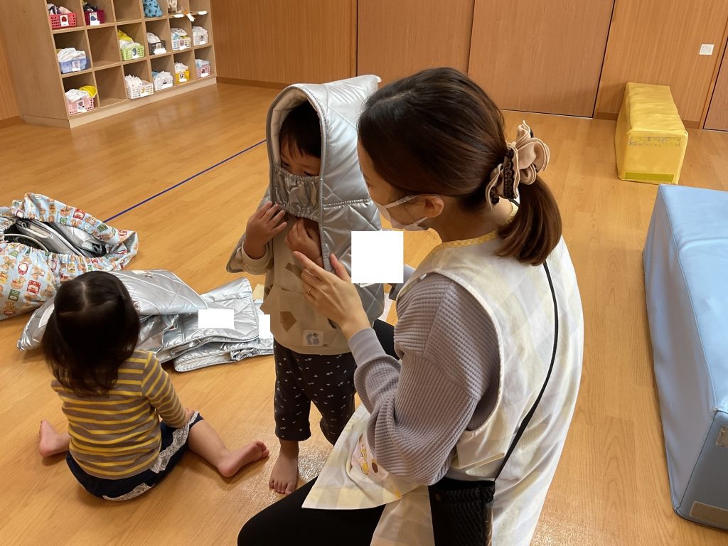 保育教諭が持つ場所や被り方を伝え手を添えながら行っています。