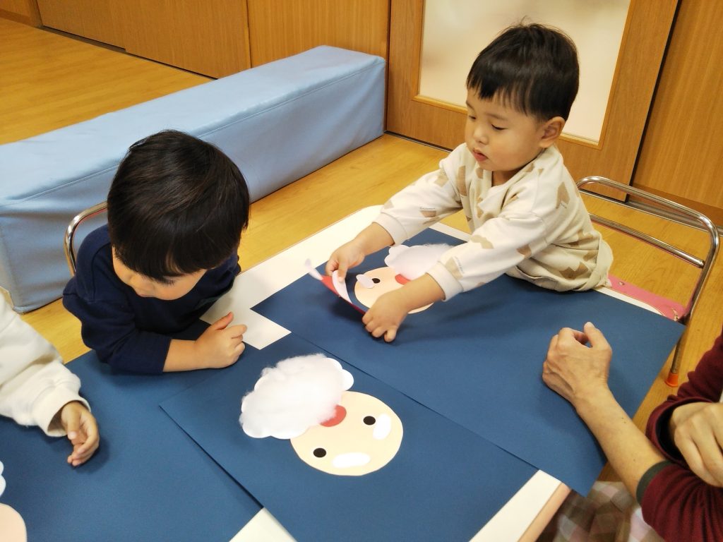 「目はどこかな?帽子はどこかな?」など、保育教諭と一緒に見本を見ながら顔のパーツを画用紙に貼り合わせていきました。