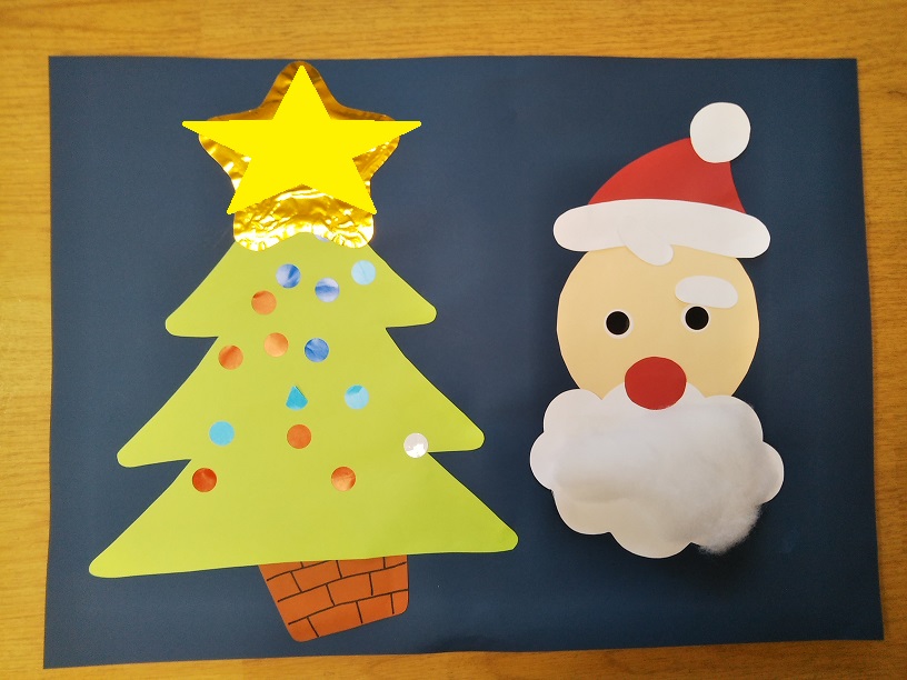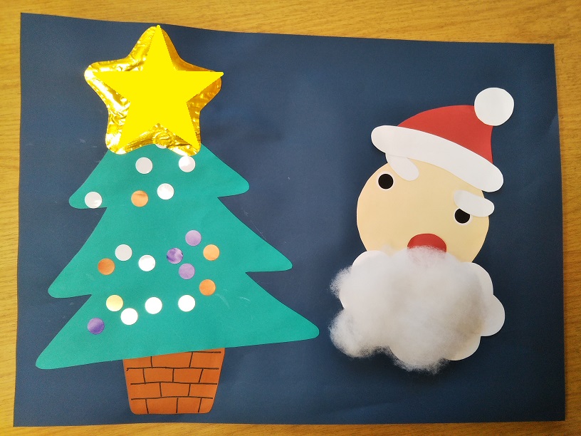 表情豊かなサンタさんを、シール貼り製作で作ったツリーの隣に並べて貼ると・・・とても素敵な作品になりました☆