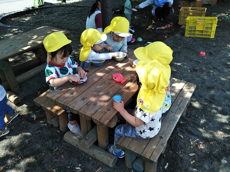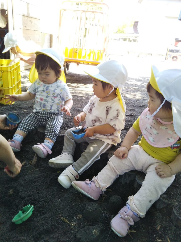 友だちや保育教諭の様子を見たり砂の感触を楽しんだり…