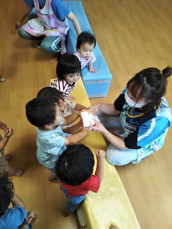 出来るようになると得意げになったり保育教諭とハイタッチをして喜んだりし友だちと一緒に