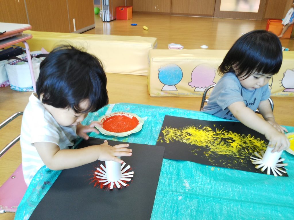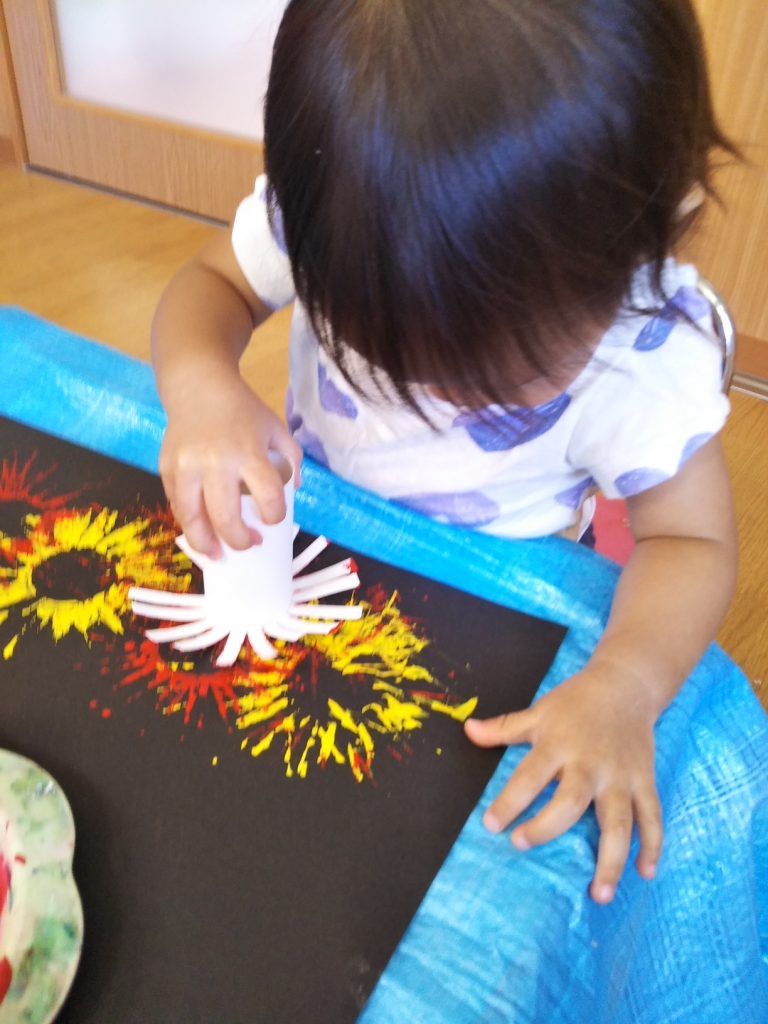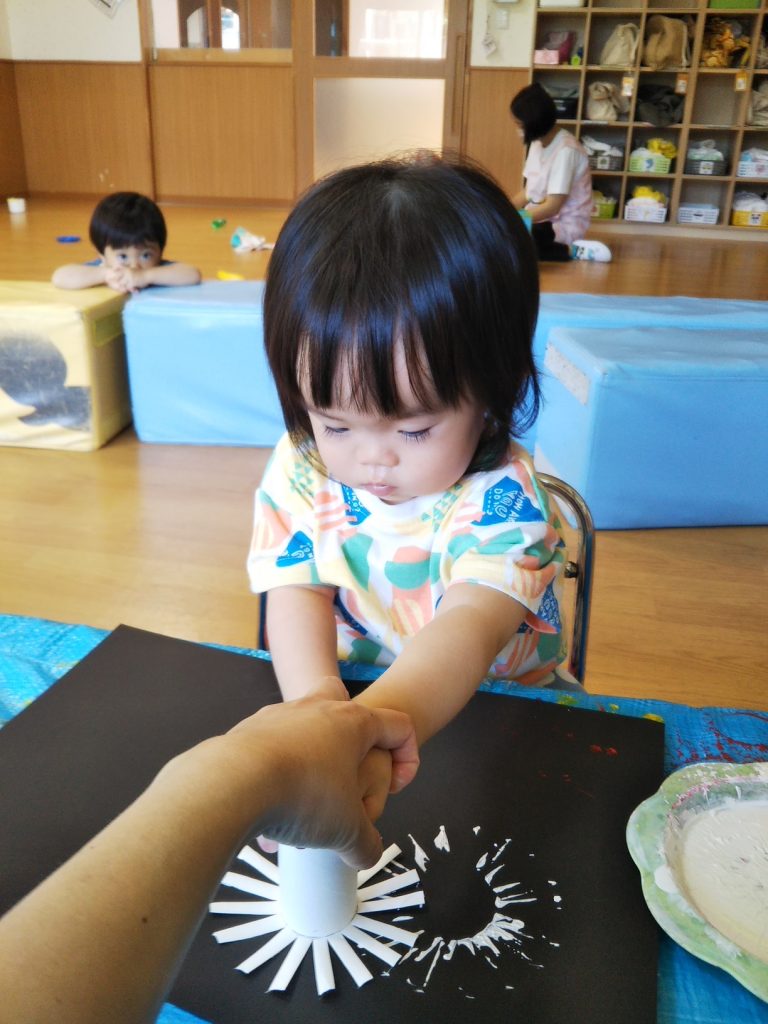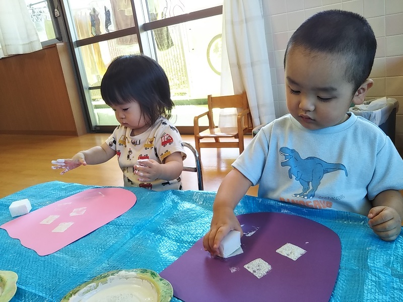 好きな色を選んで、スポンジを氷に見立ててスタンプをしました。
