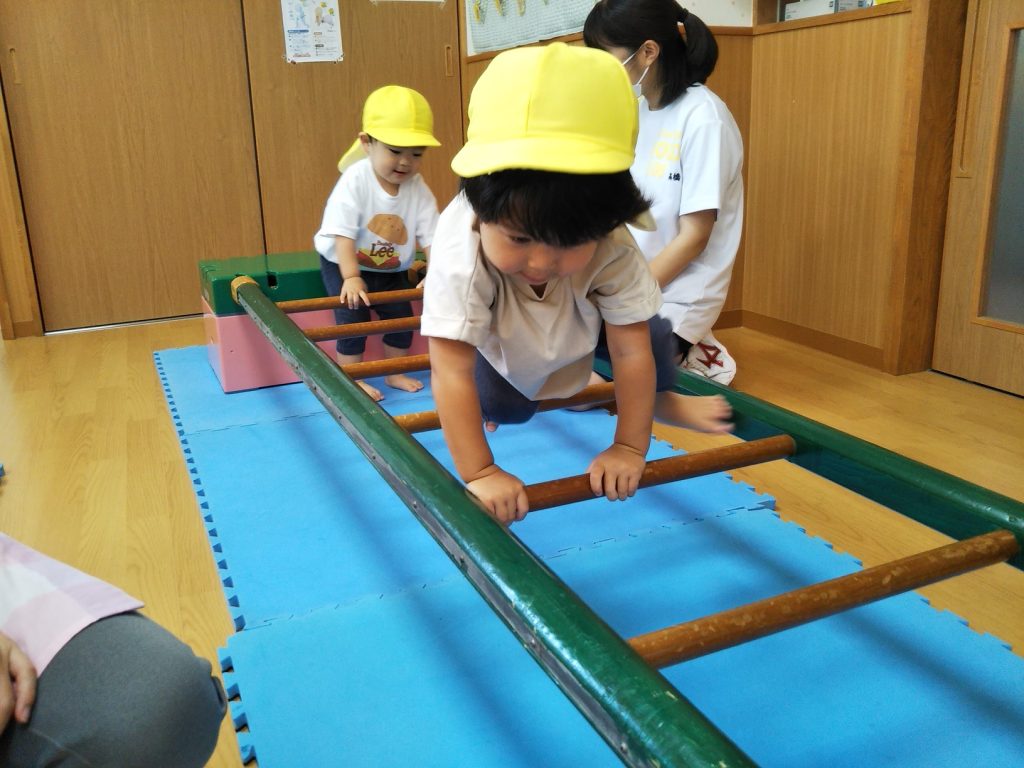 子供たちの様子に合わせて高さを調節しています。梯子を握り跨いでみたりくま歩きで進んでみたり、