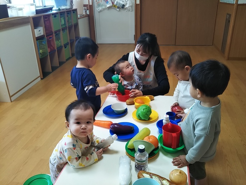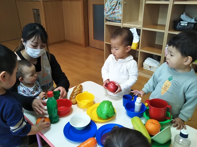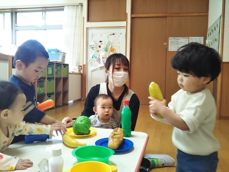 ままごとでは、様々な食べ物の名称に興味を持つ子が増えてきました。「りんご」「ばなな」と名称を伝えると、真似して話す姿が多く見られました。