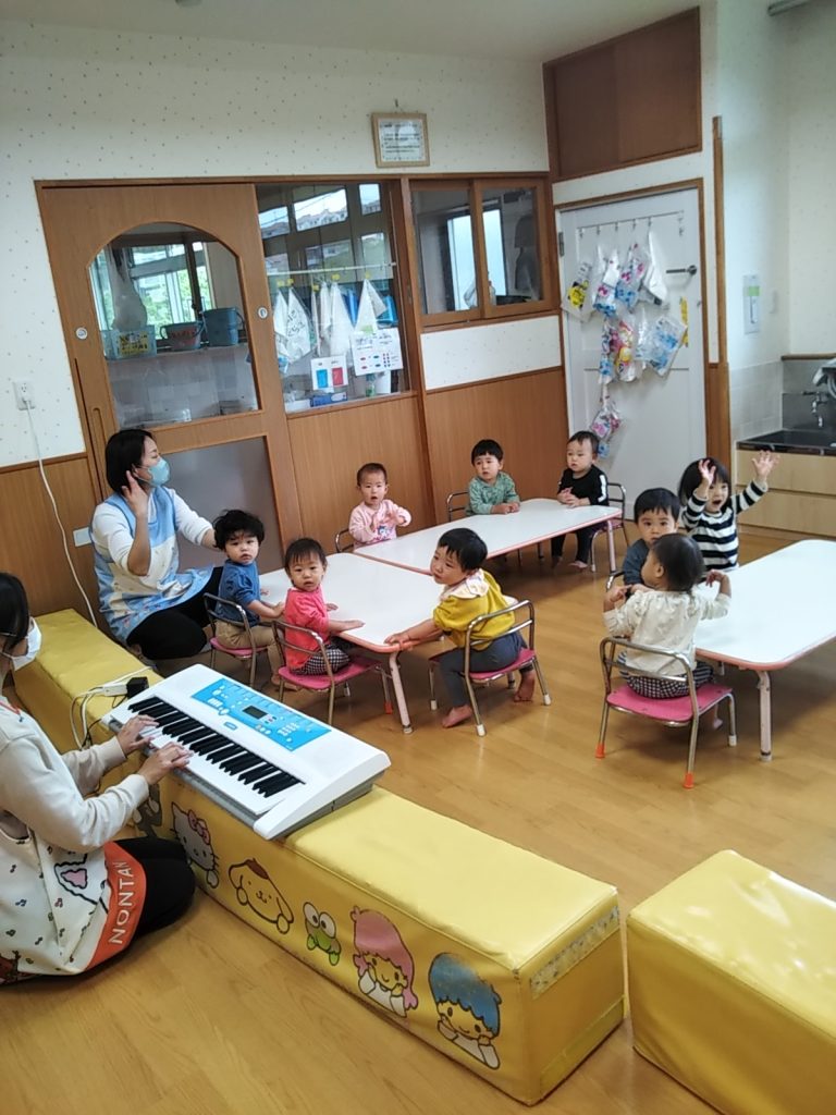 歌った後は名前を呼び、出席確認をしています。自分の名前を呼ばれると、手を挙げて返事をする姿が増えてきました(*^^)v
