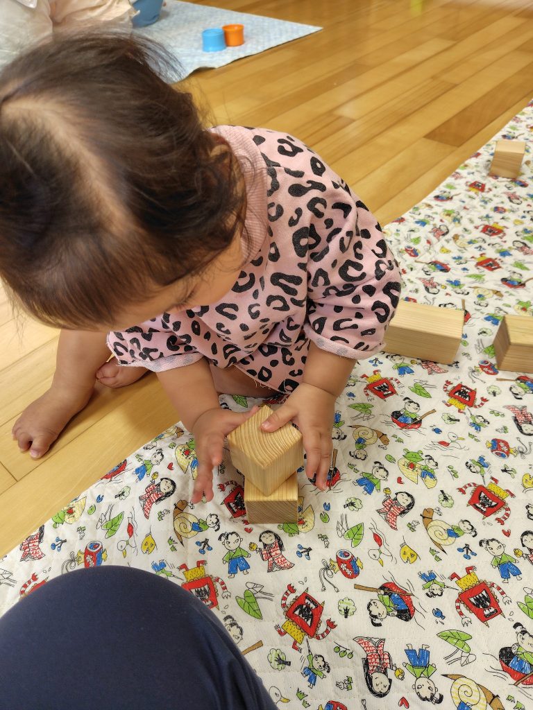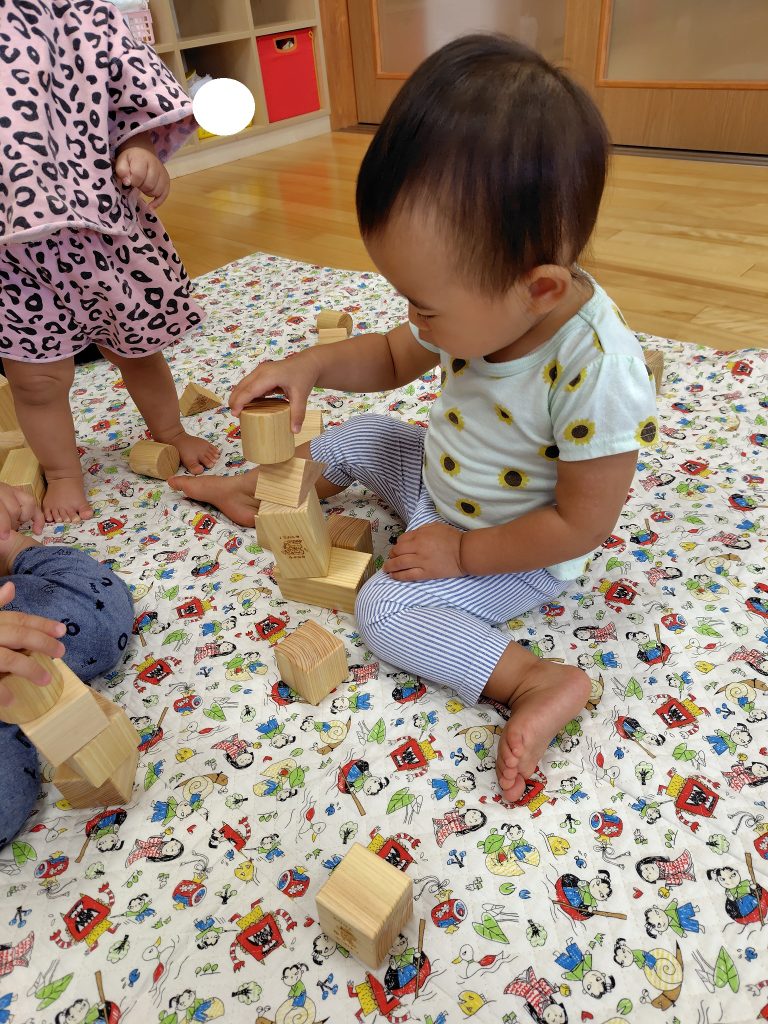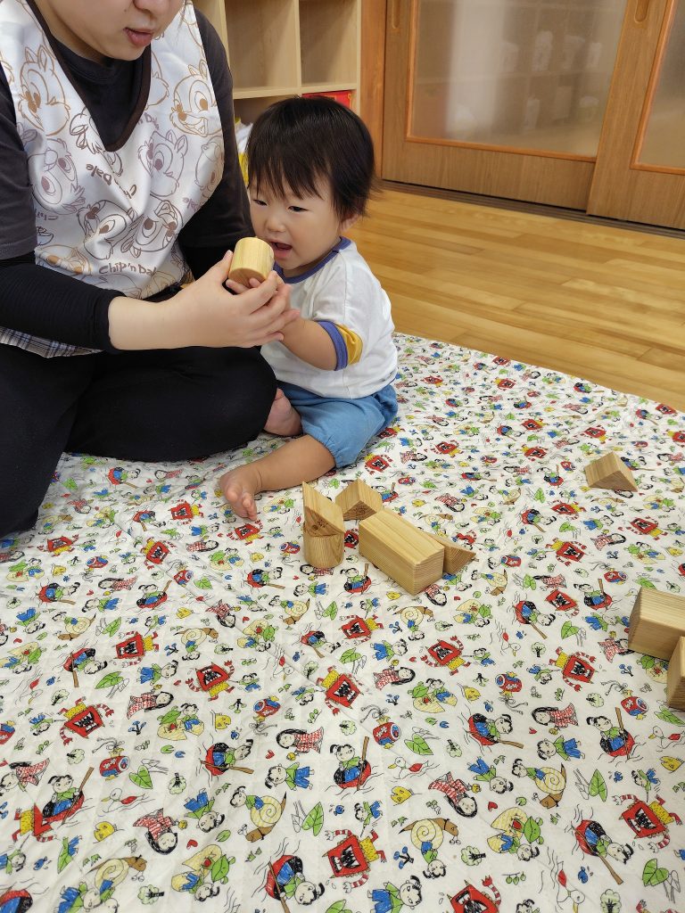 積み木では、保育教諭と「積み木は色々な形があるね!木の匂いがするよ♪」などとやり取りを楽しむ姿も見られました(#^^#)